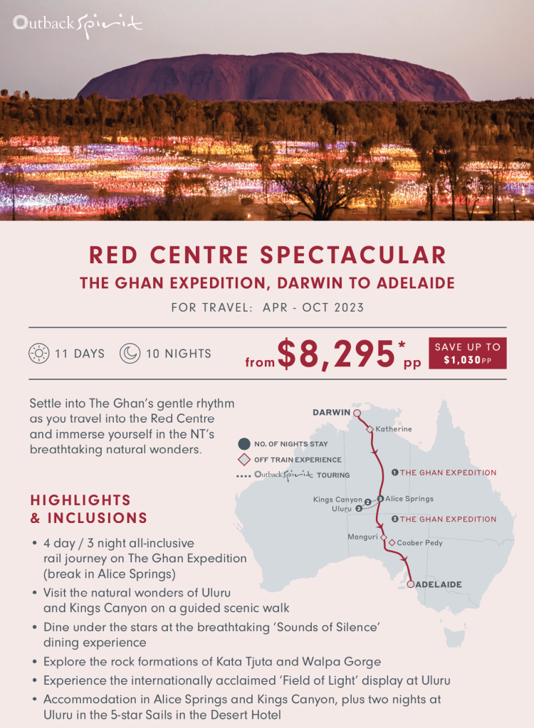 - Red Centre Spectacular Packages available for travel 01 April – 31 October 2023