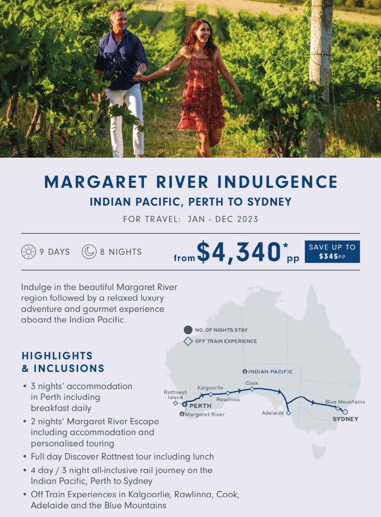 Terms & Conditions: *Red Centre Spectacular: Advertised prices are per person, based on the Advance Purchase Holiday fare in a Gold Service Twin Cabin on the Ghan Expedition in April 2023. Package valid for travel between 01 April to 31 October 2023. Margaret River Indulgence: Advertised prices are per person, based on the Advance Purchase fare in a Gold Service Twin Cabin on the Indian Pacific in June 2023. Package valid for travel between 01 January to 31 December 2023. Offer is subject to availability. Blackout dates apply. Save up to price is based on the difference between the Advance Purchase Holiday fare and the Everyday Holiday fare. If advertised hotel is not available, a similar property of Journey Beyond’s choosing will be booked. Full payment is required at time of booking. Booking and credit card fees may apply. 100% cancellation fees apply. The fare is non-transferable and non-refundable. Should suspension of services occur due to government-imposed restrictions, 100% of the monies paid will be placed in a future travel credit. All guests booked on a JBRE Rail Journey or Holiday Package will be required to be fully vaccinated for travel from 01 January 2022. Proof of vaccination will be required at check-in and must be sighted by Journey Beyond staff. Any Federal and/or State government mandates requiring vaccination before the date mentioned above will supersede the above date. Please visit https://www.journeybeyond.com/ about/covid-update/ for further details about the Covid Safe Experiences & Vaccination Policy. For full terms & conditions visit http://www.journeybeyondrail.com.au/terms-conditions/. ~QANTAS FREQUENT FLYER: You must be a Qantas Frequent Flyer Member to earn Qantas Points. QFF members can earn 1 Qantas point per AU$1 spent on eligible rail holidays.